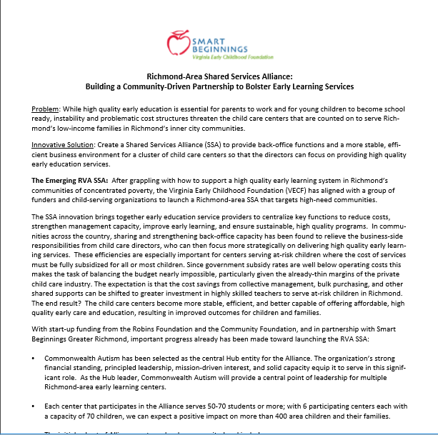 Richmond-Area Shared Services Alliance Summary: Building a Community-Driven Partnership to Bolster Early Learning Services
